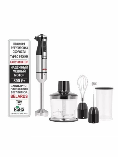 - Насадки: венчик для взбивания, вспениватель молока, насадка блендер