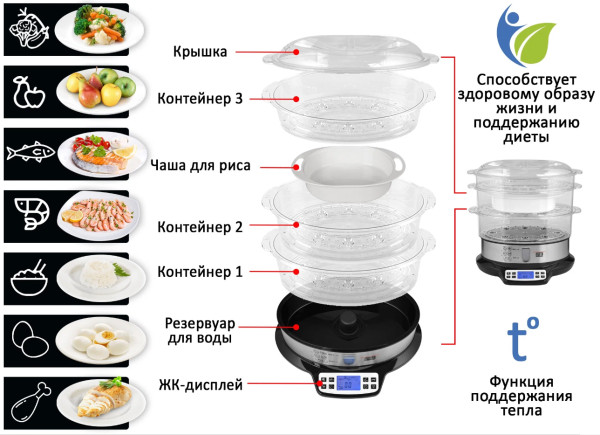 - Объем паровых корзин: 3 л / общий 9 л
