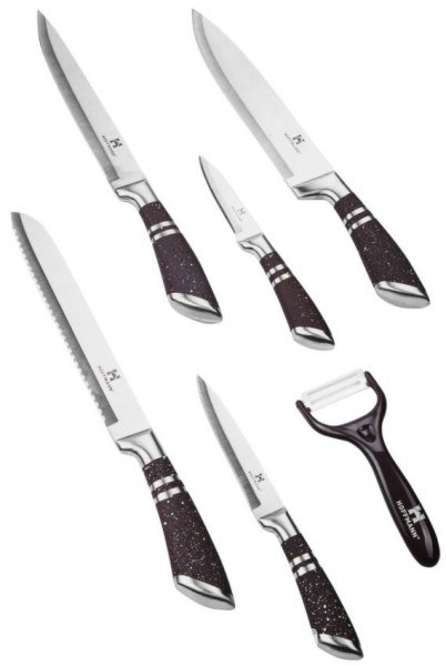 - КомплектацияПоварской нож. Нож для хлеба. Нож для нарезки. Универсальный нож. Нож для чистки овощей и фруктов. Керамический пиллер. Металлическая прямоугольная подставка.
