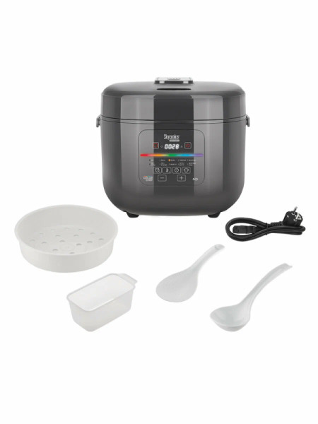 - Комплектациякнига рецептов, мерный стакан, плоская ложка, сервисная книжка, черпак, контейнер для приготовления на пару, мультиварка, руководство по эксплуатации, чаша, шнур электропитания