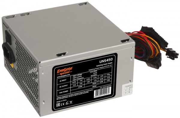 Exegate Special UNS450, 450Wб ATX, SC, 12cm fan, 24p+4p, 6/8p PCI-E, 3*SATA, 2*IDE, FDD + кабель 220V с защитой от выдергивания (ES261568RUS-S)